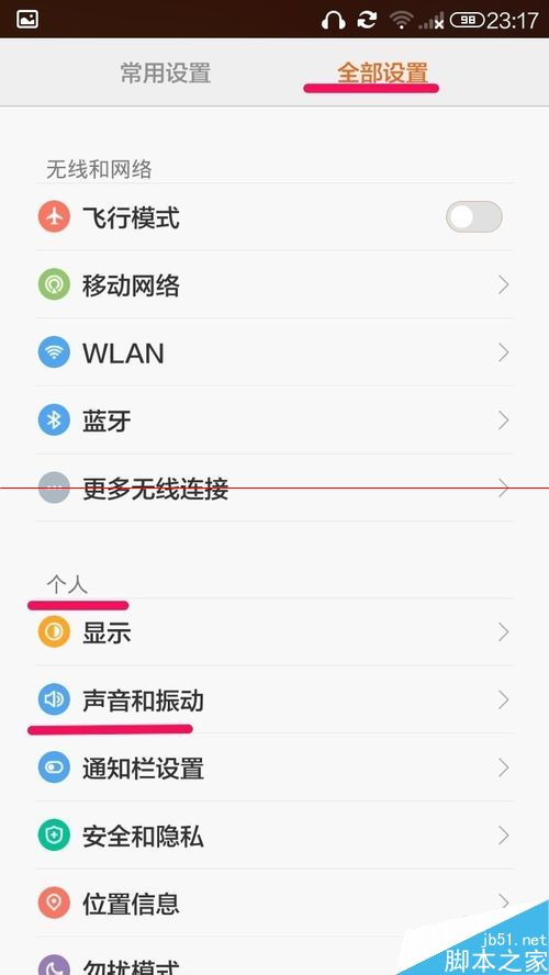 2、进入设置界面后,点击全部设置——个人——声音和振动。