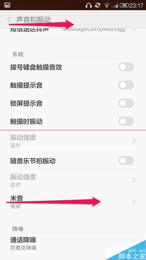 3、在声音和振动界面,点击米音栏。