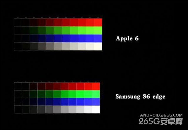 我做了一组S6 edge和iPhone 6屏幕实拍的对比,从色阶图来看,两者屏幕的显示效果几乎相差无几,而且S6 edge在红色和绿色上相比后者更准,蓝色则稍有偏差,但肉眼观感差距非常小。