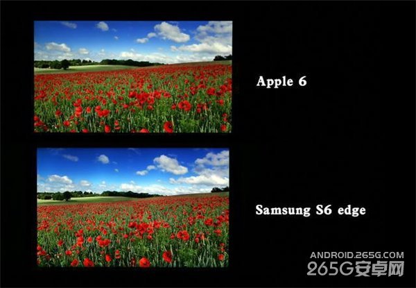 实际的图片对比来看,S6 edge的屏幕在显示红色和绿色的时候,整体的效果要比iPhone 6更好,蓝色的部分显得稍冷。