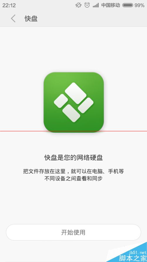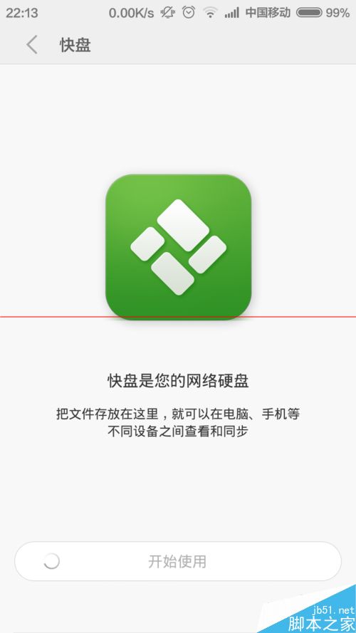 3、在使用快盘文件应用的时候,记得首先连接到互联网,无论是使用无线WLAN连接还是使用数据流量连接,点击“开始使用”,然后等待快盘完成应用的初始化。
