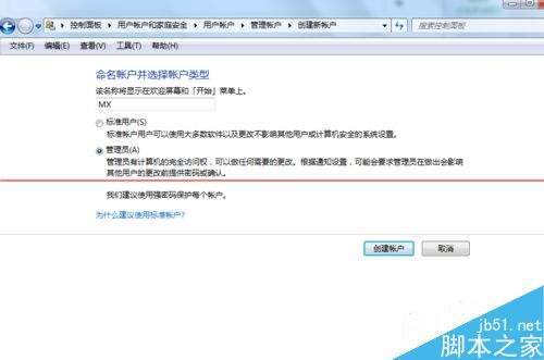 7、给自己的账户起个名字。我直接起个MX。要给这个账户管理员级别。这样对文件可以有修改、挪动权限