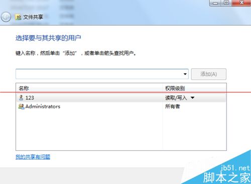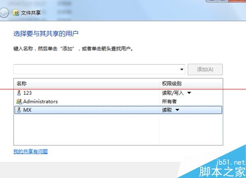11、在下拉列表中,找到你要添加权限的MX账户,确定。添加。在下面出现了MX后,可以在权限上给它读取或者写入。最后共享,就可以看到文件已经共享出去