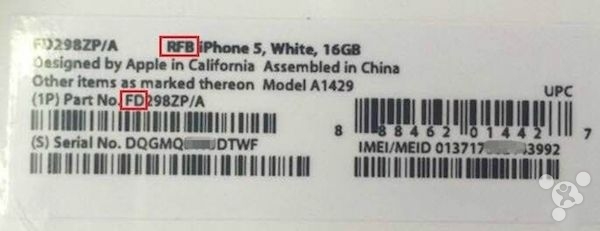 标签特征,iPhone 5标签与iPhone 5s不一样,是纯黑的。iPhone 5 前面的“RFB”是refurbished的缩写,意为翻新。官翻机序列号开头为 DQG、DQH、C7G、C3M等。