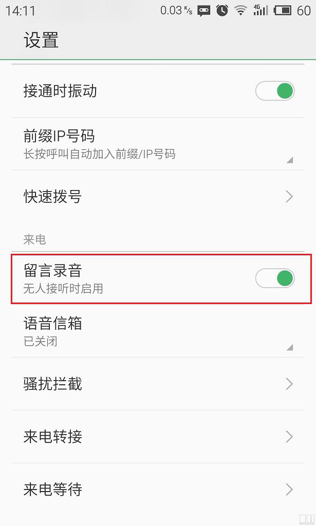 三.进入设置后,找到“留言录音”功能,然后将此功能开启,如图所示。