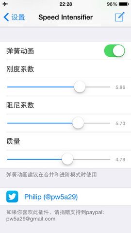 此外在插件当中还可以对于是否在图标震动时使用加速进行选择,用户还可以对弹簧动画的各种数值进行设置,而黑名单功能则让用户可以对个别应用进行设置。值得提醒的是,在选择较高速率时在打开应用程序的时候会出现卡顿的情况,此时降低速率即可。目前插件在Cydia当中完全免费,且已经支持了iOS 8,感兴趣的用户都可以下载一试。