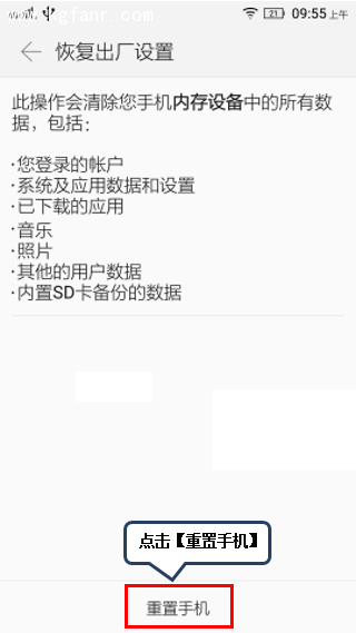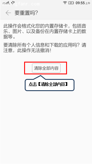 5,点击【清除全部内容】,手机进行恢复出厂设置操作,如下图所示: