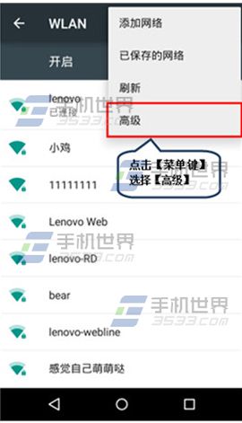 1)打开Moto X手机【设置】点击【WLAN】,点击【菜单键】选择【高级】。(如下图)