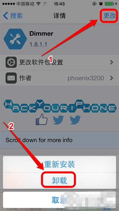 4、点击更改/卸载(其实ios的伪安全模式就是为了卸载和系统有冲突的插件)。