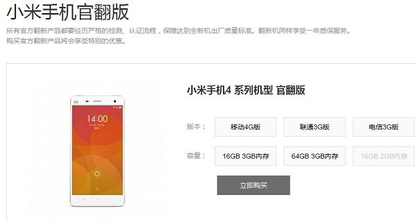小米4官翻机多少钱 小米4官方翻新机购买网址