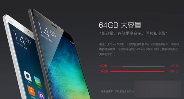 小米Note上市之处,16GB版本售价2299元,64GB版本售价2799元,两者有500元的差价,因此这两款手机中16GB版本的性价比更高一些。