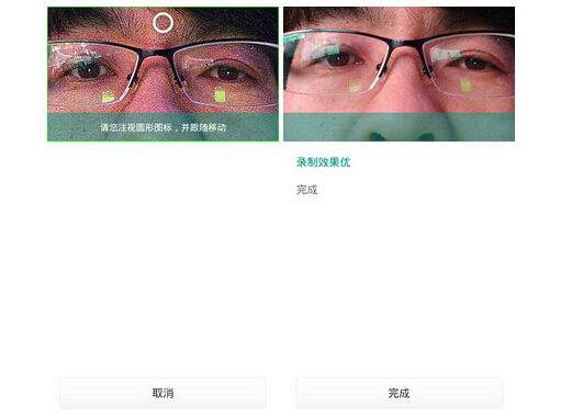 眼纹解锁的录制过程较为简单,用户只需要按照界面提示跟随界面上的圆形图标移动即可完成眼纹录入的过程,并且系统会根据用户的眼纹录入质量评估眼纹是否可以用户解锁。