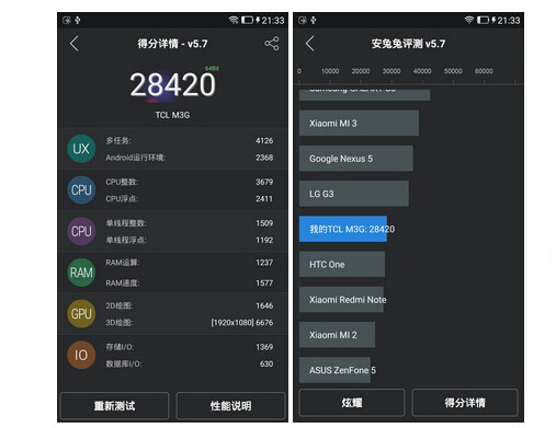 安兔兔评测AnTuTu Benchmark是一个专门给Android系统的手机、平板电脑硬件跑分的软件,它能一键运行完整测试项目,通过内存性能、CPU整数性能、CPU浮点性能、2D、3D绘图性能、数据库I/O、SD卡读、写速度等多项性能测试,并对手机的整体和单项硬件性能做出评分。通过安兔兔的硬件测试我们看到整体硬件方面的跑分成绩为28420分,在同配置产品当中属于正常表现。