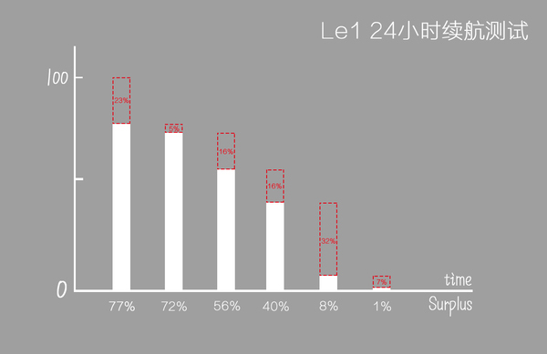 从早上电量100%开始,看了2小时电影消耗了23%,剩余77%;听1小时音乐消耗5%,剩余72%;刷了2小时微信微博消耗16%,剩余56%;接着玩1小时游戏(益智类小游戏)消耗了16%,剩余40%;最后上了3小时网消耗了32%。除去以上实际手机工作的情况,另有15小时的待机时间,消耗了7%的电量。至此,24个小时的中度使用下来后,剩余电量还剩1%