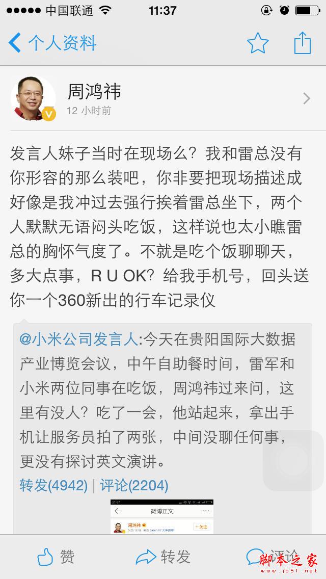 晒合照一事,更多是周鸿祎的冷幽默,但小米的官方回应却过于严肃且不解风情。毕竟网友在看到、评论周鸿祎与雷军的合照微博时,基本都是怀着娱乐的态度;但小米公司发言人的回应,却将娱乐行为转化成敌对情绪,难道已经有人开不起玩笑了吗?