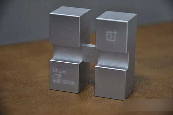 打开后一个四四方方的小盒子映入眼帘,上面印有“H2 OS”,打开小盒子后一个正方体金属块就出现了,难怪这么重呢。其实这是一个孔明锁,小编以前也没有接触过这个,孔明锁上印有一加的logo,还有H2OS的标志。