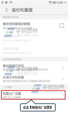 1)打开联想乐檬K3手机【设置】点击【备份和重置】,选择【恢复出厂设置】。(如下图)