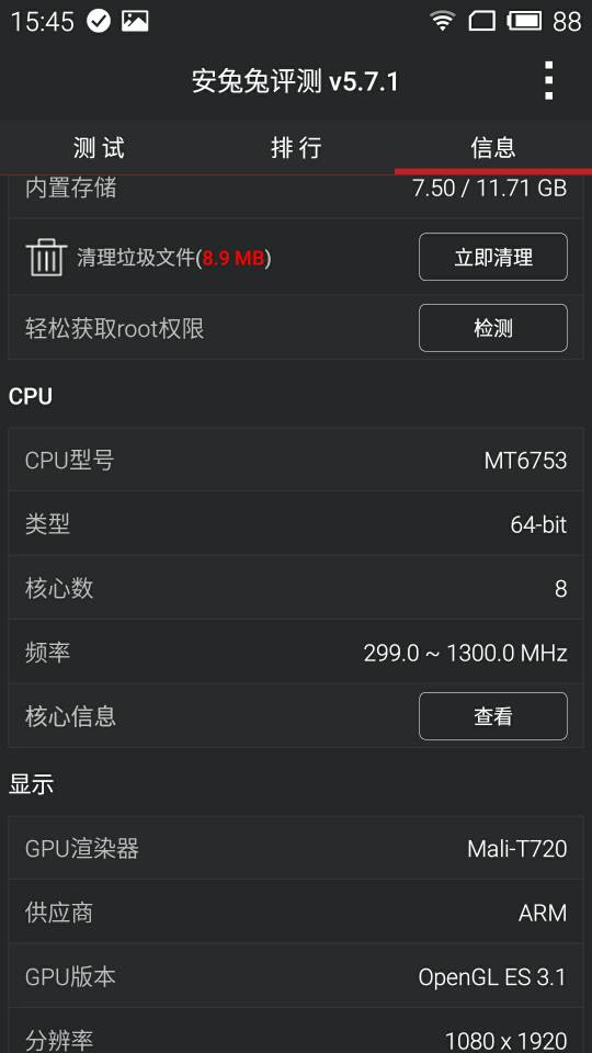 处理器:1.3GHz的联发科MT6753八核处理器,带Mali-T720 GPU