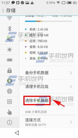 1)进入魅蓝Note2【设置】界面,点击【存储】点击【清除手机数据】。(如下图)