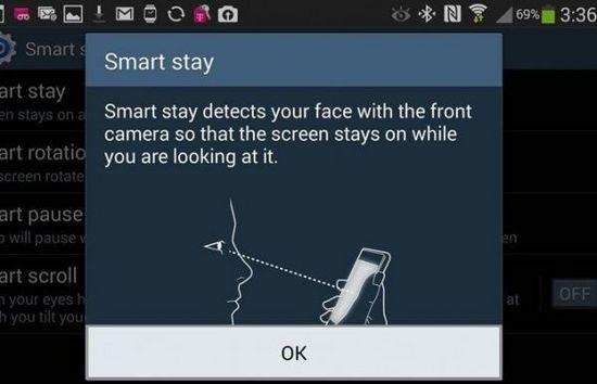 “智能停留”是三星GalaxySIII中的一个功能,它能够让前置摄像头追踪用户的眼球,当检测到用户的眼睛正在看着屏幕的时候就会阻止屏幕暗下去或者自动关闭。比如,用户在查看网页或者阅读电子书的时候,即使长时间不操作手机屏幕也不会关闭。但是,如果用户在手机上观看一部并不吸引人电影的时候,用户的眼睛也时刻不能离开屏幕,因为手机在检测到眼球移动后便会自动停止播放。
