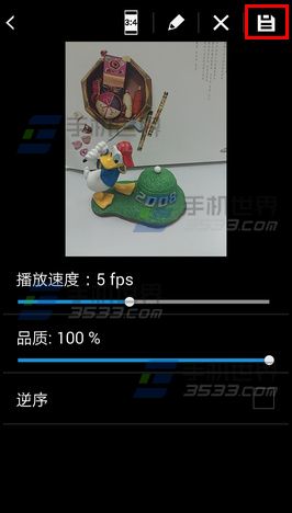2)然后长按【快门键】进行拍摄,拍摄完成后,还可以对该GIF的播放速度和图片质量进行调整,最后点击右上角【保存按钮】进行保存。(如下图)