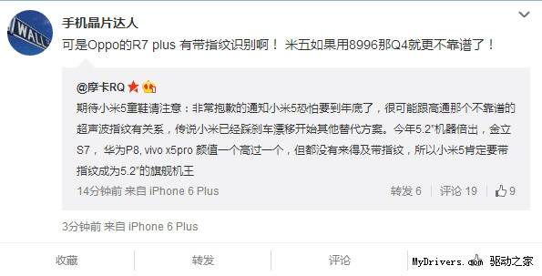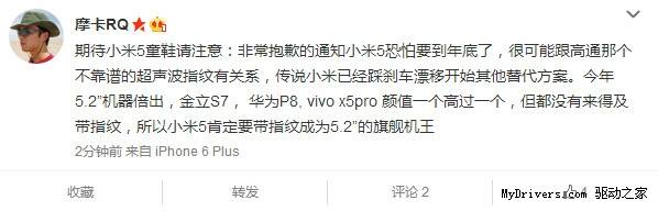@摩卡RQ这条微博中,另一条有用的线索是小米5可能会采用5.2英寸显示屏,而搭载指纹识别的目的就是为了成为5.2英寸机皇。