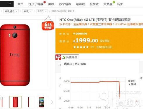 据苏宁产品页面显示,这款One M8e 4G双卡双待联通版参与了苏宁618年中庆活动,其售价已从2988元大幅降到了目前的1999元最低水平,降幅达近1000元。值得注意的是,此次仅有宝石红配色可选。