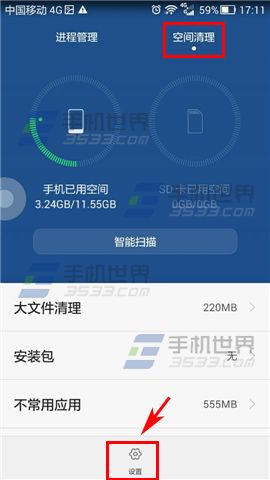 1)打开荣耀6【手机管家】,点击【加速优化】,在【空间清理】界面中点击【设置】。(如下图)