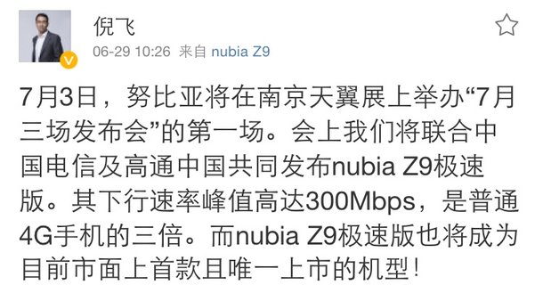 6月29日消息,此前,我们曾经报道过,努比亚将在未来一个季度内有三场发布会。如今第一场发布会的内容已经确定下来了。努比亚总经理@倪飞 今天 在微博上透露,努比亚将在7月3日在南京电信天翼展上,联合中国电信以及高通中国共同推出“无边框手机”nubia Z9极速版,也就是此前被国内媒体称作“Z9S”的那款机器。