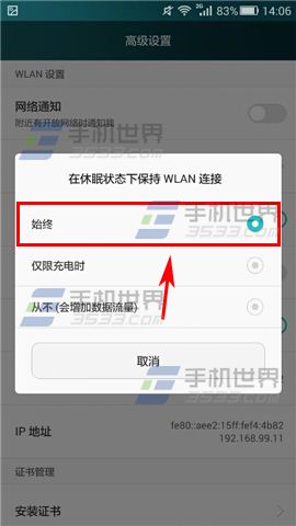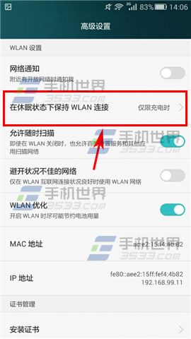 2)找到【休眠状态下保持WiFi连接】将选项设置成【始终】即可。(如下图)