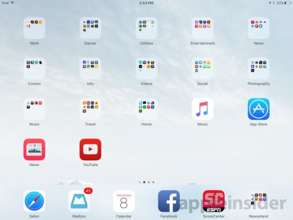 为了体现出iPad大尺寸屏幕的优势,在最新发布的iOS 9 Beta3版本中,iPad设备的应用文件夹采用了4X4的排列设计,每个文件夹每一页现可放置/显示16个应用。之前iPad的文件夹同iPhone版本一样都是以3X3的应用排列显示的,这项改动也体现出苹果正不断优化并调整iPad的特性,以更好地利用iPad产品线7.9寸-9.7寸大屏幕