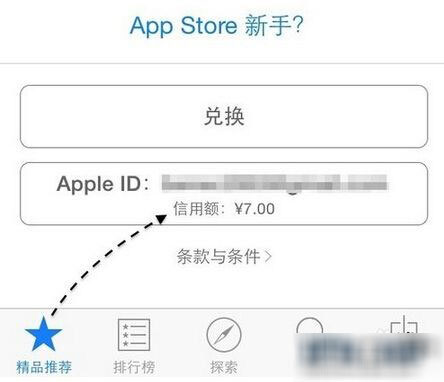 打开 App Store 商店以后,在“精品推荐”栏目的底部可以看到自己的 Apple ID 账号,点击它。