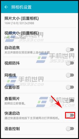 1)进入三星S6相机界面,点击右上角【齿轮】进入照相机设置,开启【快速启动】右边按钮。(如下图)