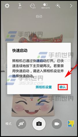 2)开启后返回主页面,在关闭屏幕状态下连续按下主页键两次即可进入照相机,阅读完【快速启动】后点击【确认】。(如下图)