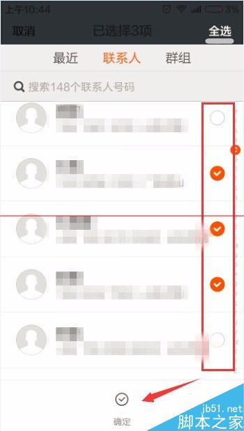 4、我们可以点击右上角的全选按钮,将我们通讯录的所有人都选中。当然我们也可以自己选择,点击每个人后面的白色圈圈,选中的人员就会在白色圈圈中出现一个对号。然后点击确定。