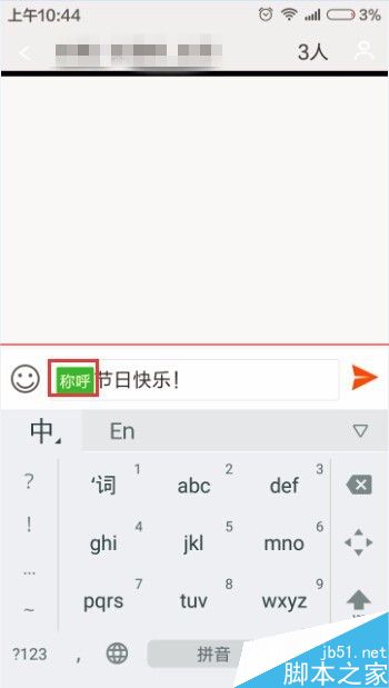 8、在短信编辑界面我们就会发现在短信编辑区域中多了两个不同颜色的字,叫做称呼,这就是我们刚才设定的昵称,我们可以在这后边继续编辑短信内容,在我们点击发送之后,给每个人的短信就是我们设定好的昵称和短信内容了。这样我们就能即体现出我们发短信的诚意,还方便我们自己。