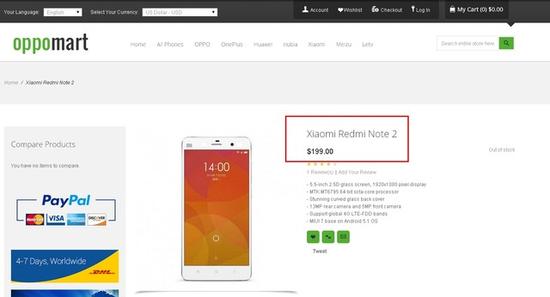 据gsmarena报道,国外一家专门销售中国品牌手机的电商oppomart已经上线红米Note 2商品页面,标价199美元(约合1279元人民币),不过目前还无法购买