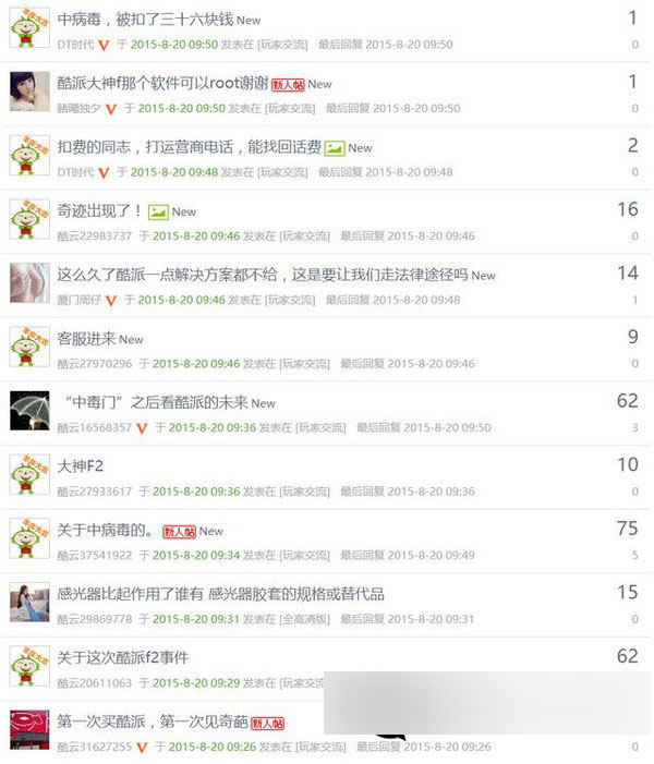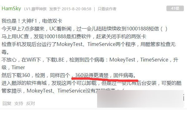 从酷派大神官方论坛可以看到,很多用户都在反映系统更新后存在病毒,使用安全软件检测到存在四个病毒,包括MokeyTest、TimeService、升级与Timer程序。