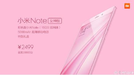 小米Note女神版全球首发2万台,定价2499元,也就是粉色版小米note,该机的配置和小米Note完全一致,包括5.7英寸1080p触控屏、四核2.5GHz骁龙801处理器、3GB内存、16GB机身存储空间、400/1300万像素摄像头等等。
