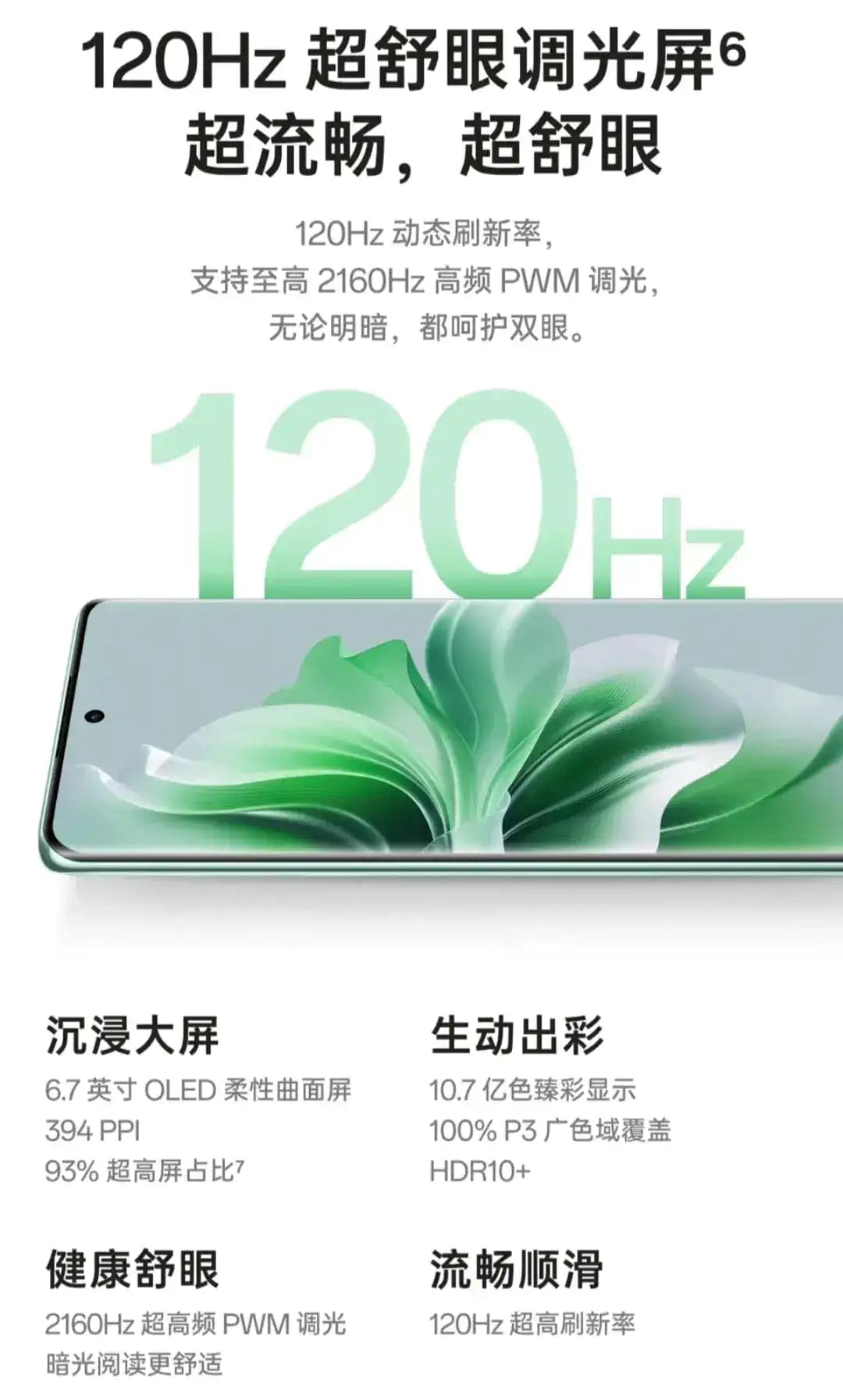 Reno11采用6.7英寸曲面屏,1080P分辨率,120Hz刷新率,局部峰值亮度950nit,支持2160Hz高频PWM调光。
