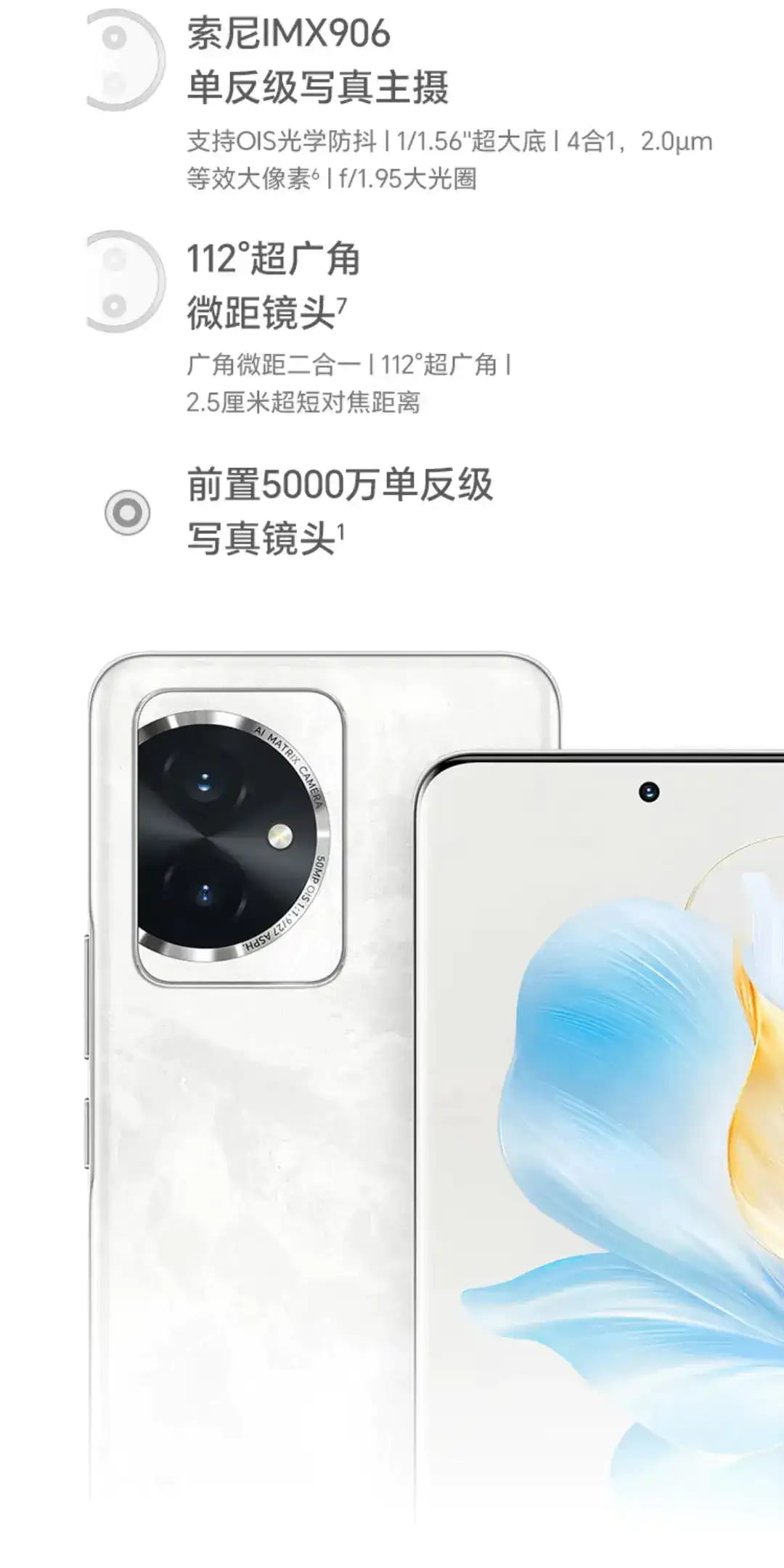 荣耀100前置50MP,后置50MP主摄(索尼IMX906,1/1.56英寸,OIS防抖)+12MP超广角微距;