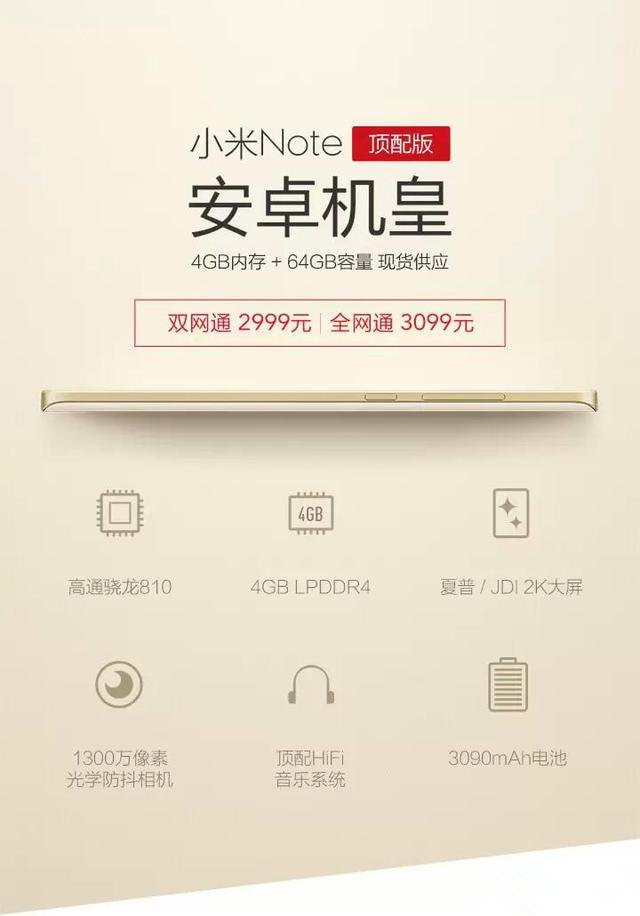 小米note顶配版,5.7寸2K屏幕,骁龙810八核,内置4GB+64GB内存,拥有前置400万+后置1300万像素光学防抖相机,3090毫安时电池,支持HiFi。