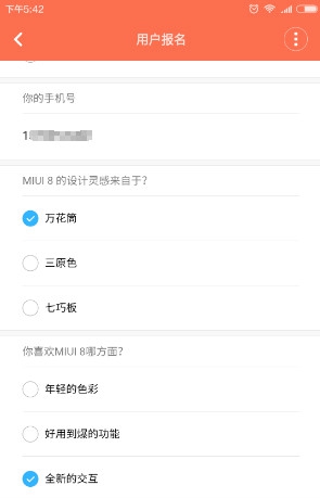 4、在“用户报名”页面中,需要填写“申请内测机型”、“手机号码”以及“MIUI8的设计灵感”、“MIUI8的特色方面”内容信息,并点击“提交资格”按钮。其中“MIUI8的设计灵感”部分选择“万花筒”。