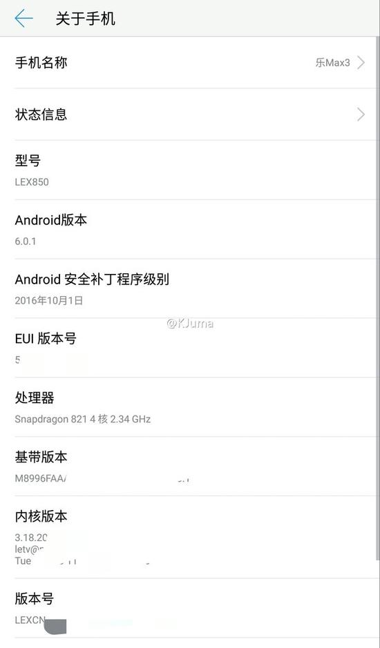 现在,微博网友@KJuma在微博上曝光了疑似乐Max 3的系统截图,最大的亮点就是搭载了主频为2.34GHz的骁龙821处理器。