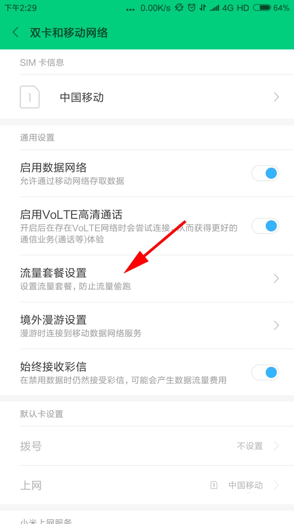 3、进入到双卡和移动网络界面,点击流量套餐设置