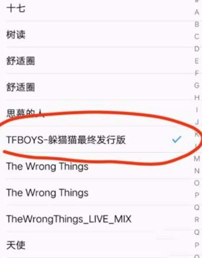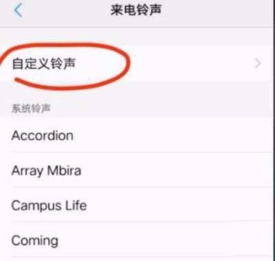 6、自定义点进去,这里选择想要设置为来电铃声的音乐,可以看到后面有个蓝色的小勾勾出现,点右上角的完成。