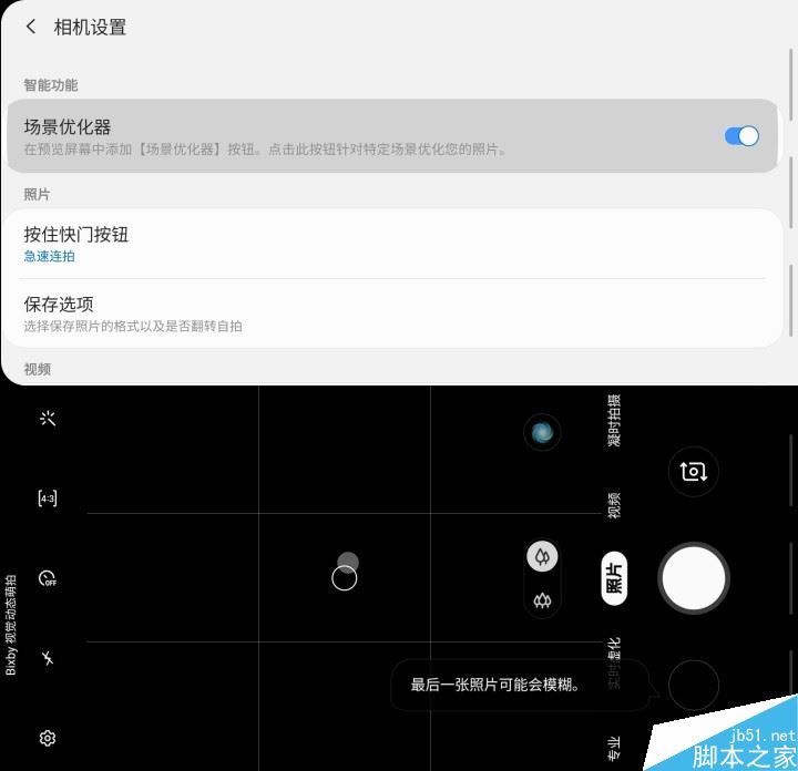 在A60元气版这块Infinity-O屏幕那个打孔的UI/UX交互上,三星也是下了不小的功夫。笔者摸出了面部解锁、切换前置摄像头和自拍倒计时这几种交互场景。