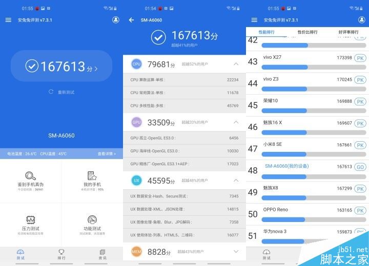 在性能方面,三星A60元气版配备的是高通骁龙675处理器,跑分如下。