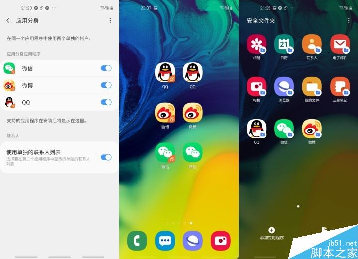 应用分身也自然不会少。如果搭配安全文件夹来使用,你在三星Galaxy A60元气版上最多可以拥有三个微信、微博和QQ,再搭配上单独的联系人列表,不论是工作、生活还是工(见)作(不)之(得)外(人)的生活都可以帮你轻松区分开。