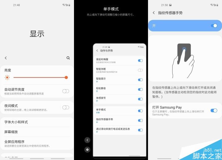One UI在(系统应用)单手操作这件事情上也展示出了三星的一贯风格——首先是笔者已经记不清从哪一代开始的单手模式;指纹传感器手势对于已经使用过三星后置指纹识别设计手机的朋友们来说应该也不陌生了,可以在主屏幕时从下向上滑动快捷呼出SAMSUNG Pay,可以在任意界面从上向下滑动呼出通知栏,再通过向上滑动隐藏回去(当然我会建议你打游戏前把这个功能关掉);还有这次One UI的新特性——绝大多数的系统应用都支持了向下滑动可以将banner顶部降至大约半屏(略高一点)处,方便日益增大的屏幕尺寸上的顶部区域操作。但是较为遗憾的是三星仍旧没有系统级的整体下拉悬停解决方案,也就是说这种操作仅仅适配于部分系统应用,这里还是有点小遗憾的。